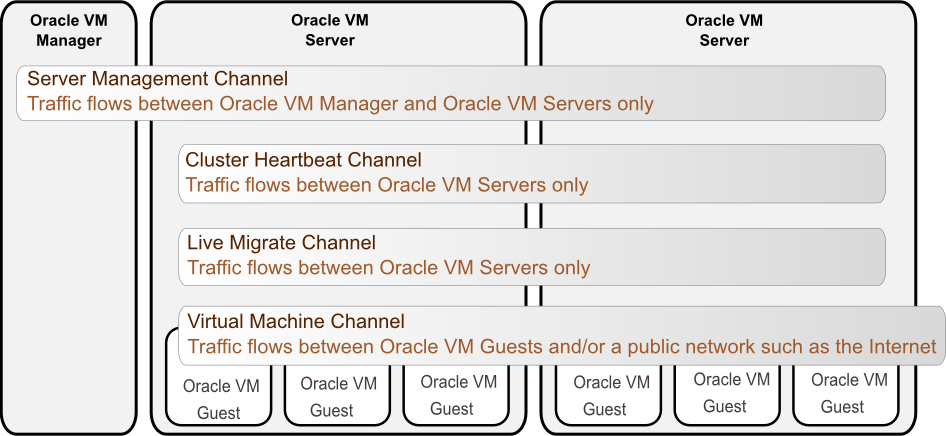 The Management channel is used to manage the physical Oracle VM Servers in a server pool, for example, to update the Oracle VM Agent on the different Oracle VM Servers. This network function is assigned to at least one network by default.