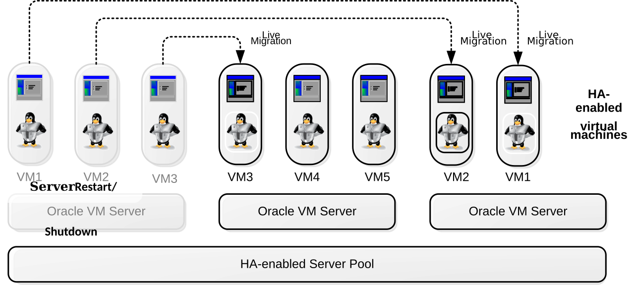 Oracle VM has high availability (HA) functionality built in. Even though there is only one Oracle VM Manager in the environment, it distributes vital information over the servers it manages, so that in case of failure the Oracle VM Manager and its infrastructure database can be rebuilt. For virtual machine HA, Oracle VM Servers can be clustered so that if one server fails, the virtual machines can be automatically migrated to another server as all virtual machine data is on shared storage and not directly on the Oracle VM Server. In case of predictable failures or scheduled maintenance, virtual machines can be moved to other members of the server pool using live migration.
