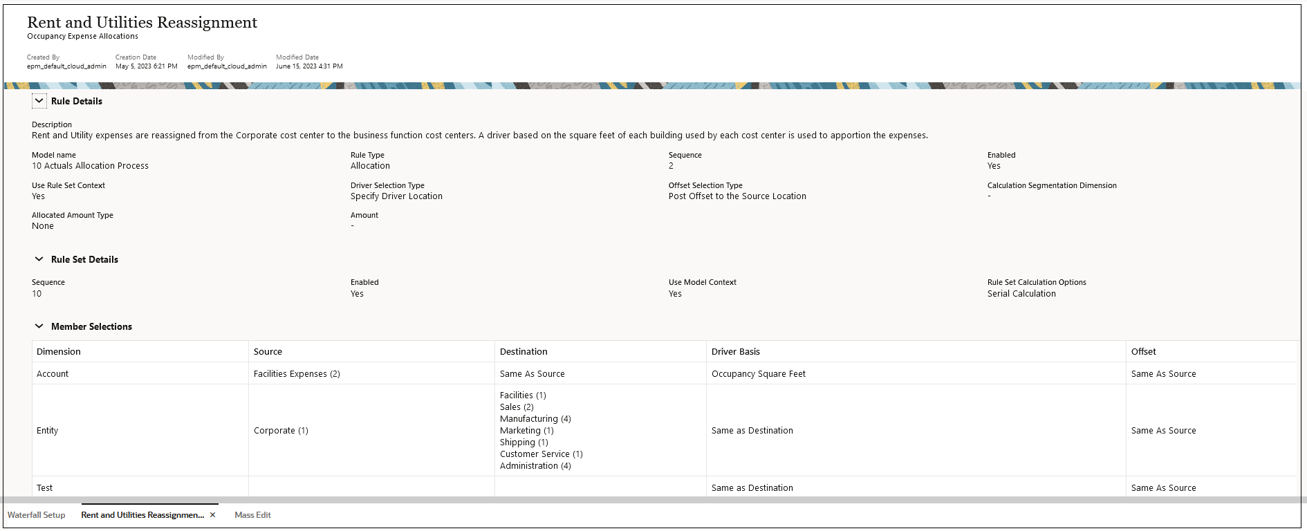 A continuación, se muestra un ejemplo de definición de regla para la regla de reasignación de alquileres y utilidades en la aplicación de muestra BksML50 que se proporciona con Enterprise Profitability and Cost Management. (Consulte Creación de la aplicación de ejemplo para obtener información sobre cómo acceder a la aplicación de ejemplo.)