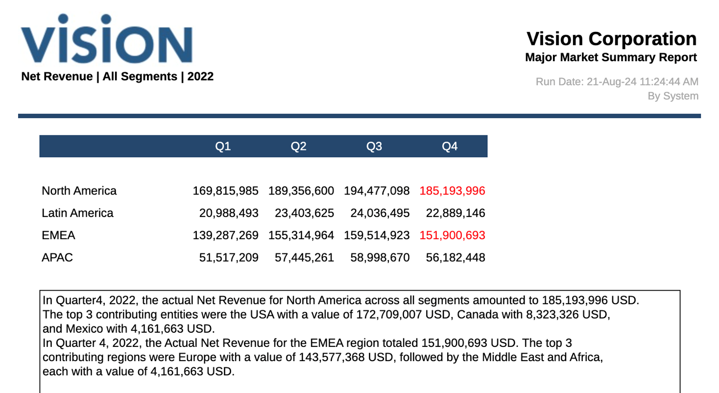 Al ejecutar el informe, según los ejemplos en los archivos de propiedades de aprendizaje automático, los resultados son los que se muestran a continuación, donde los valores de datos Norteamérica y EMEA en T4 cumplen la condición "el valor es mayor que 120 000 000". Por ello, los valores de datos aparecen en color rojo y el texto condicional del cuadro de texto bajo la cuadrícula ha usado GenAI para describir las excepciones.