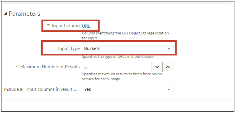 - 入力列 - 「列の選択」をクリックし、イメージまたはビデオのバケットURLまたはURIを含むデータセット列を選択します。たとえば、データセット列の名前がURLの場合は、「URL」を選択します。