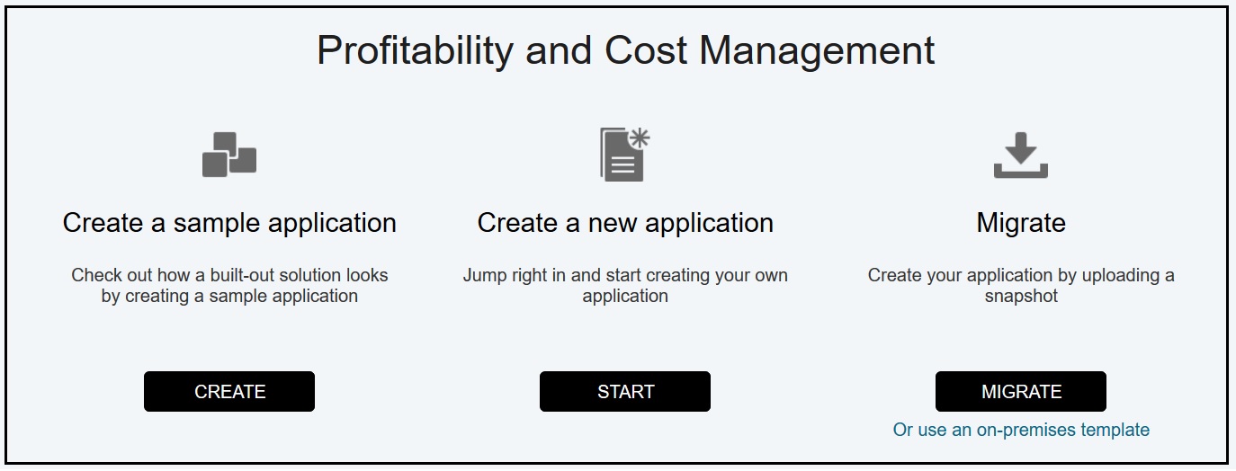 Profitability and Cost Management 애플리케이션을 생성할 수 있는 세 가지 옵션이 있습니다.