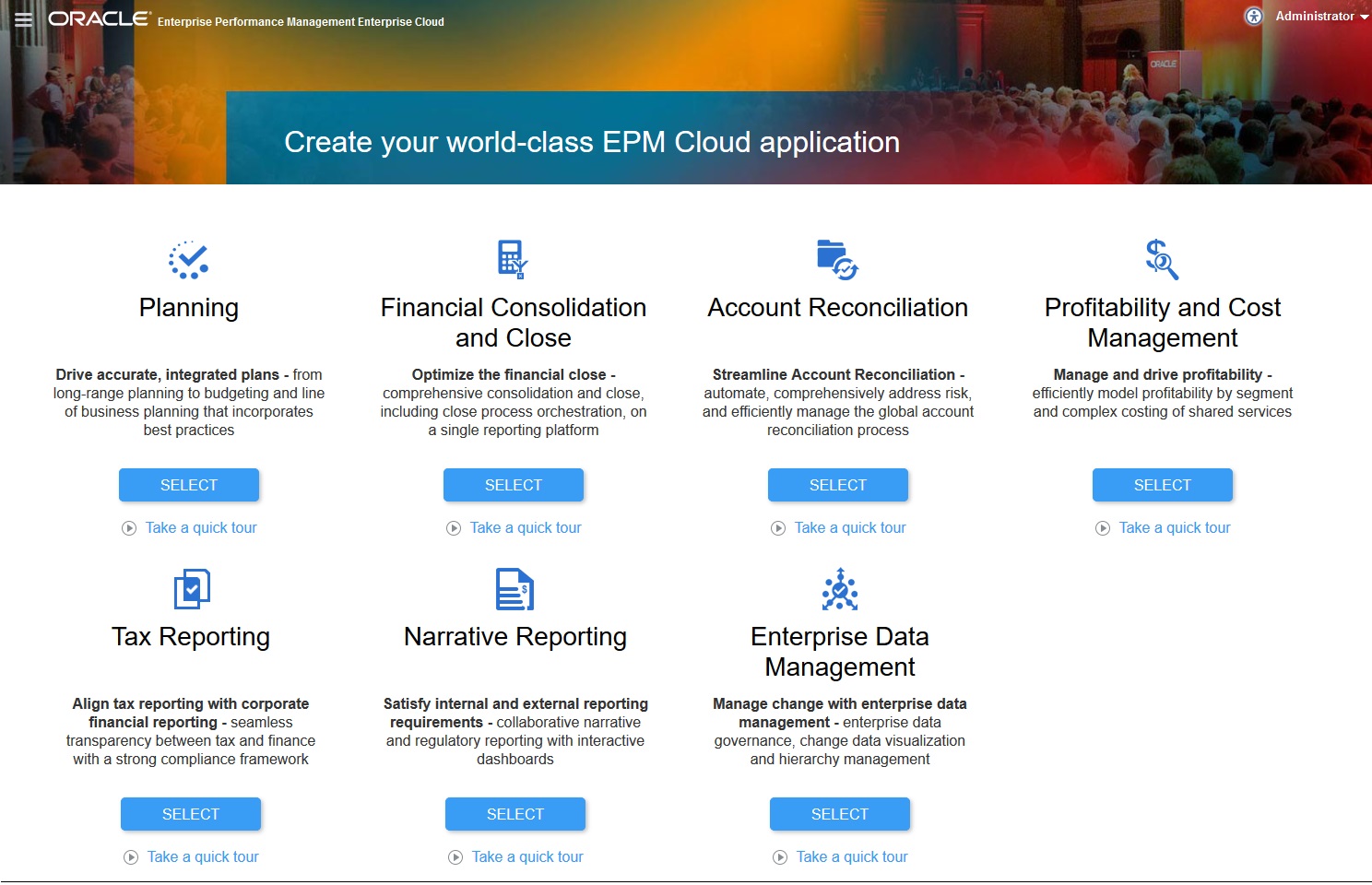 EPM Enterprise Cloud 서비스 애플리케이션이 있는 경우 랜딩 페이지는 Profitability and Cost Management 애플리케이션을 생성할 수 있으며 시작하는 데 도움이 되는 개요 비디오를 볼 수 있는 시작점입니다.