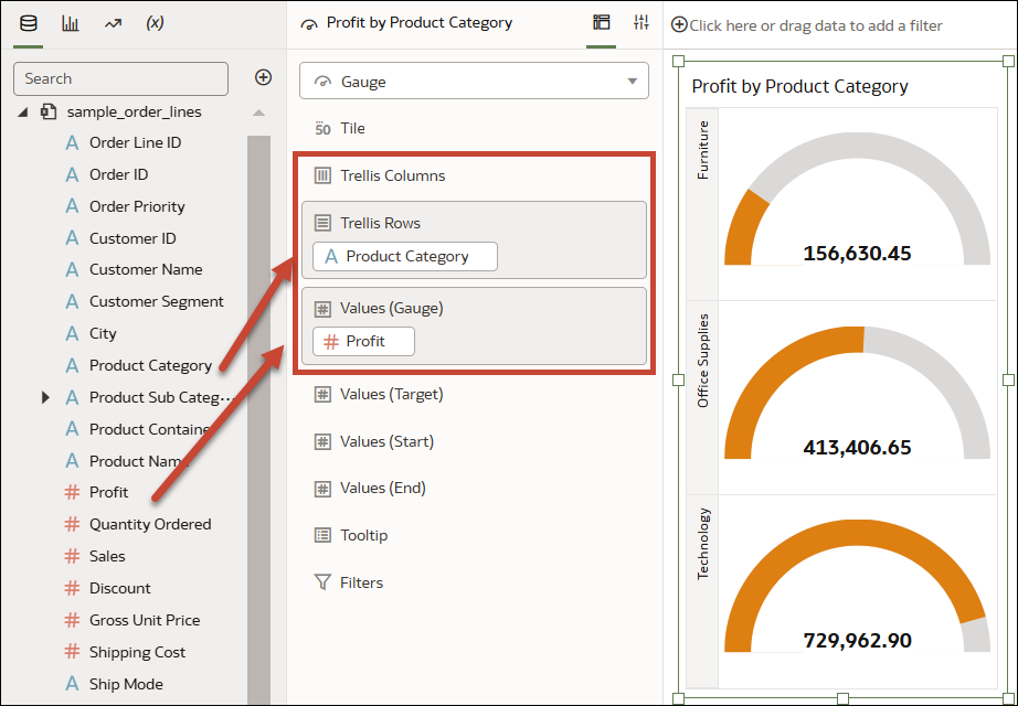- No painel Dados, arraste uma coluna de medida para Valores (Gauge) no painel Gramática.