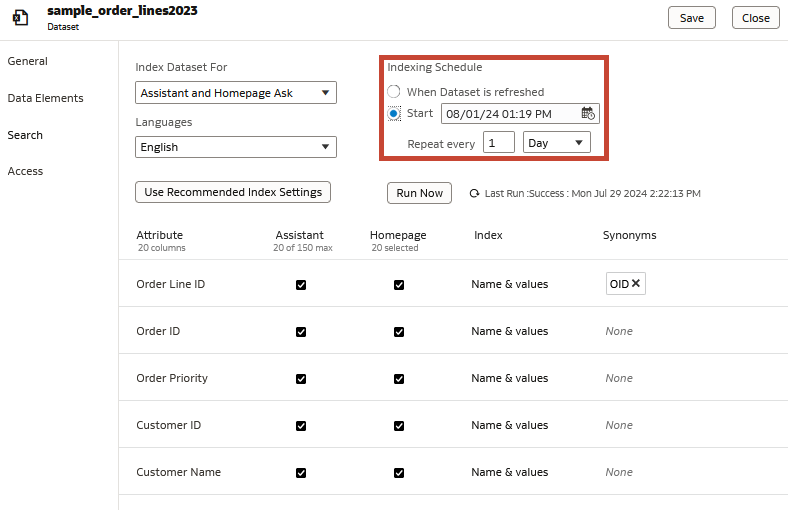 Você deve indexar um conjunto de dados para disponibilizar seus atributos de dados para a Home Page - Ask e o Oracle Analytics AI Assistant. Você pode indexar todos ou alguns atributos do conjunto de dados e aplicar sinônimos para facilitar a pesquisa dos atributos.