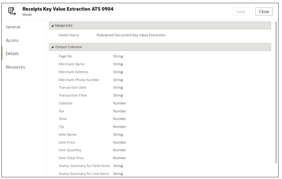 Clique em Inspecionar e, em seguida, clique em Detalhes para revisar as colunas de saída que são geradas para esse tipo de modelo.Clique em Recursos para revisar e atualizar o bucket de preparação e o respectivo compartimento.