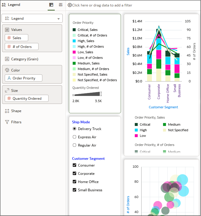 Por exemplo, na imagem, o elemento Prioridade do Pedido é arrastado para Cor no painel Gramática, os elementos Vendas e Número de pedidos são arrastados para valores no painel Gramática, e o elemento Quantidade Pedida é arrastado para Tamanho no painel Gramática.