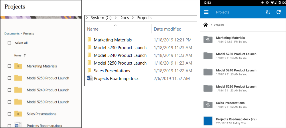 Você trabalha com arquivos no Oracle Content Management da mesma maneira que em seu computador local. É fácil agrupar seus arquivos em pastas e executar diversas operações comuns de gerenciamento de conteúdo, como copiar, mover, renomear e excluir arquivos e pastas. Se você sincronizar seu conteúdo na nuvem com seu computador local, sua estrutura de pastas virtuais será replicada em seu computador. Ela também é mostrada nos aplicativos móveis de seu smartphone ou tablet.