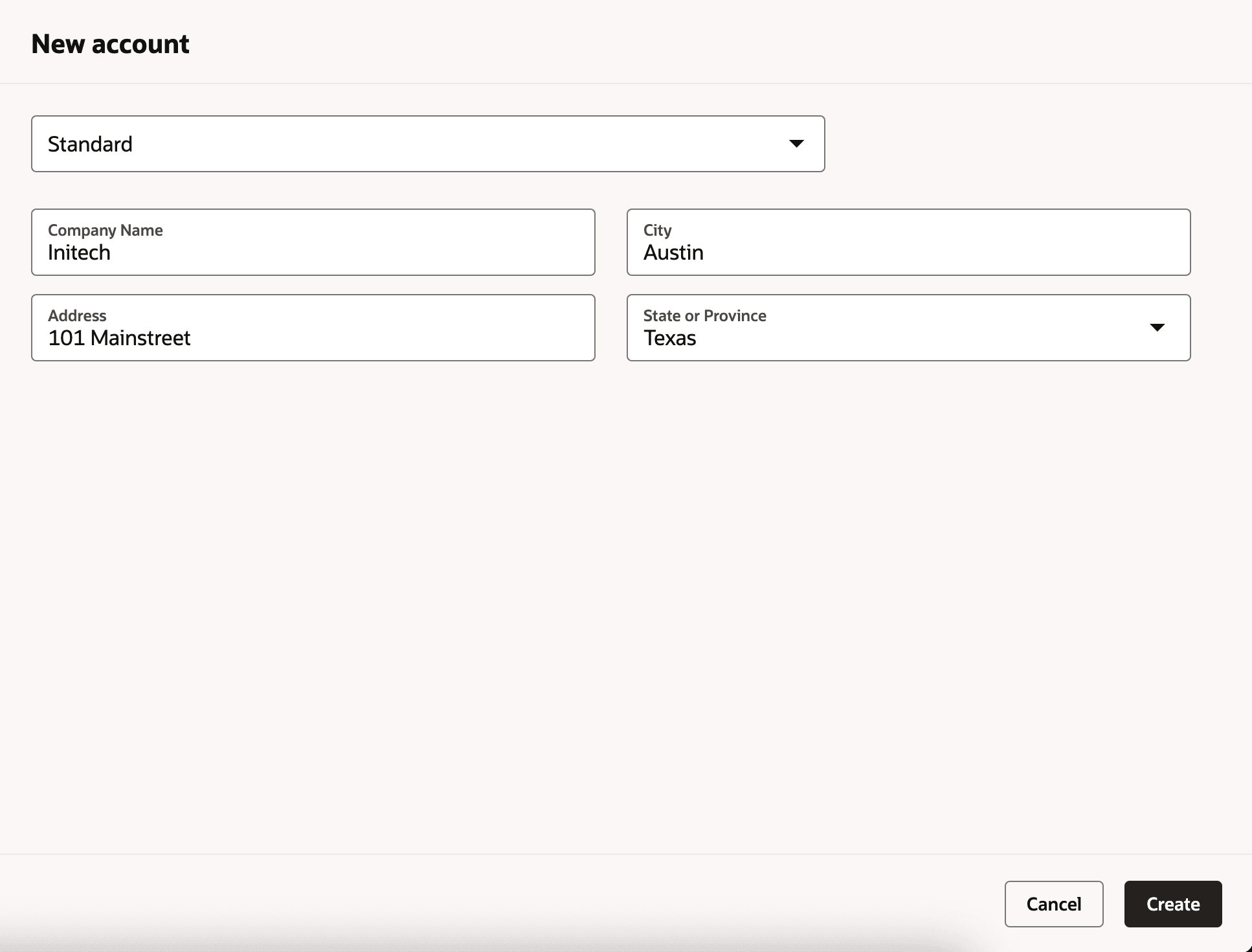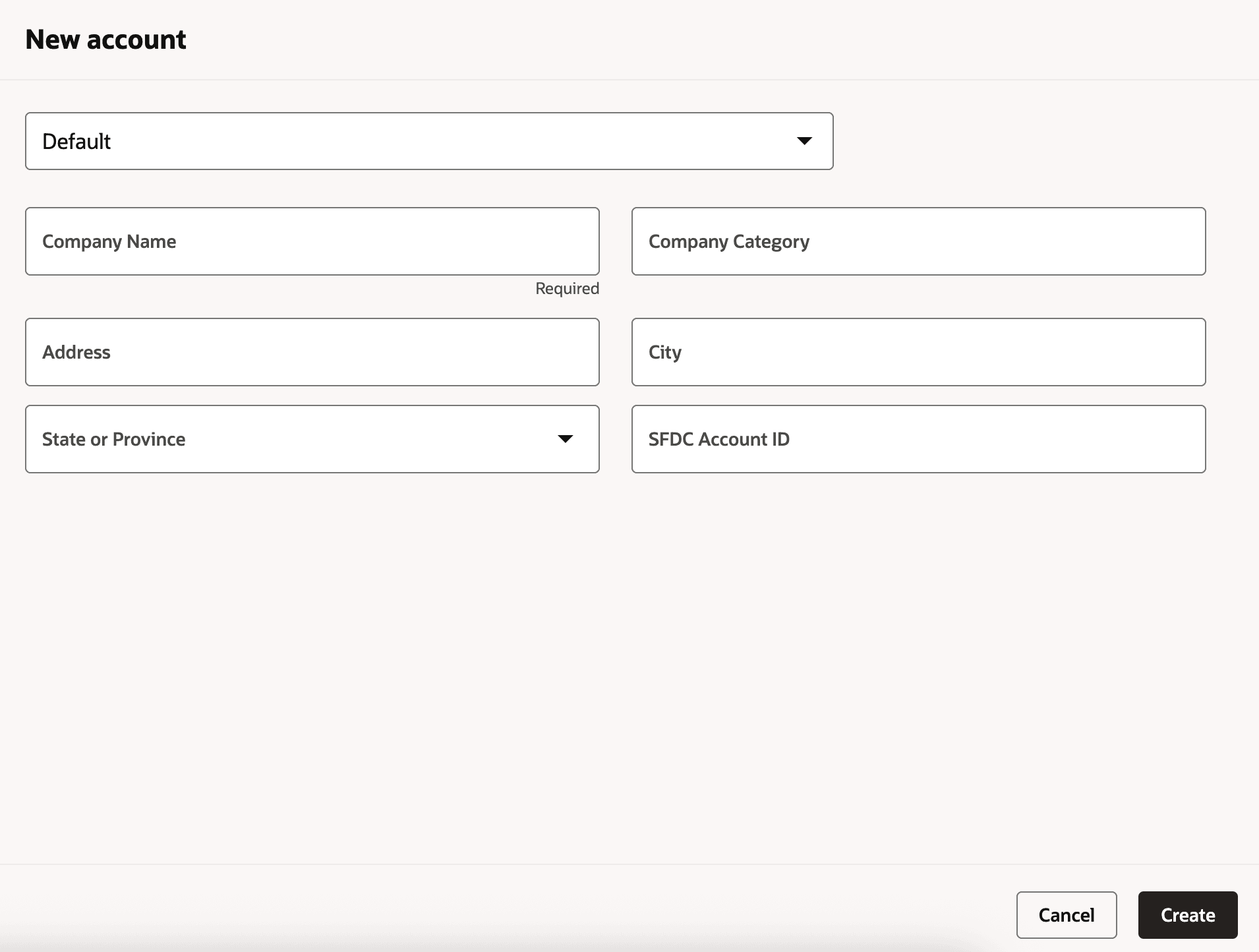 Note: An account view is a preset of account fields used to define your account. The Default account view will have the Company Name, Address, City, and State or Province account fields to define. Different account views can have different combinations of account fields.