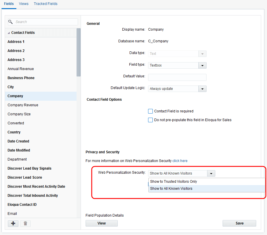Use web personalization security to add an extra layer of security to individual contact fields to ensure that sensitive data is only displayed to trusted contacts. Trusted contacts are those who have opened and clicked-through an email sent by Oracle Eloqua. This feature is available for web data lookups and field merges used on external and internal landing pages that pull data from the contact record.