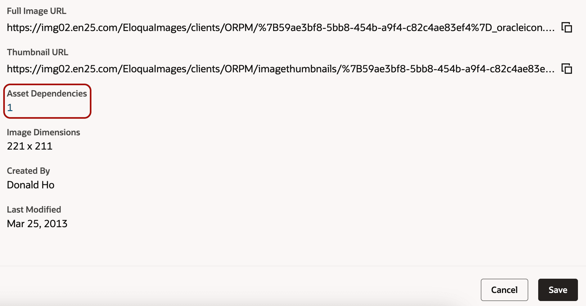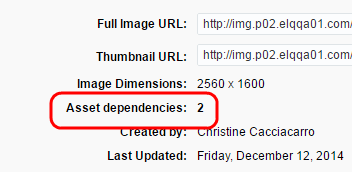Asset dependencies are assets that are affected when you update an image or file. Asset dependencies impact the actions you can perform with an image or file, and what occurs if the image or file is replaced.