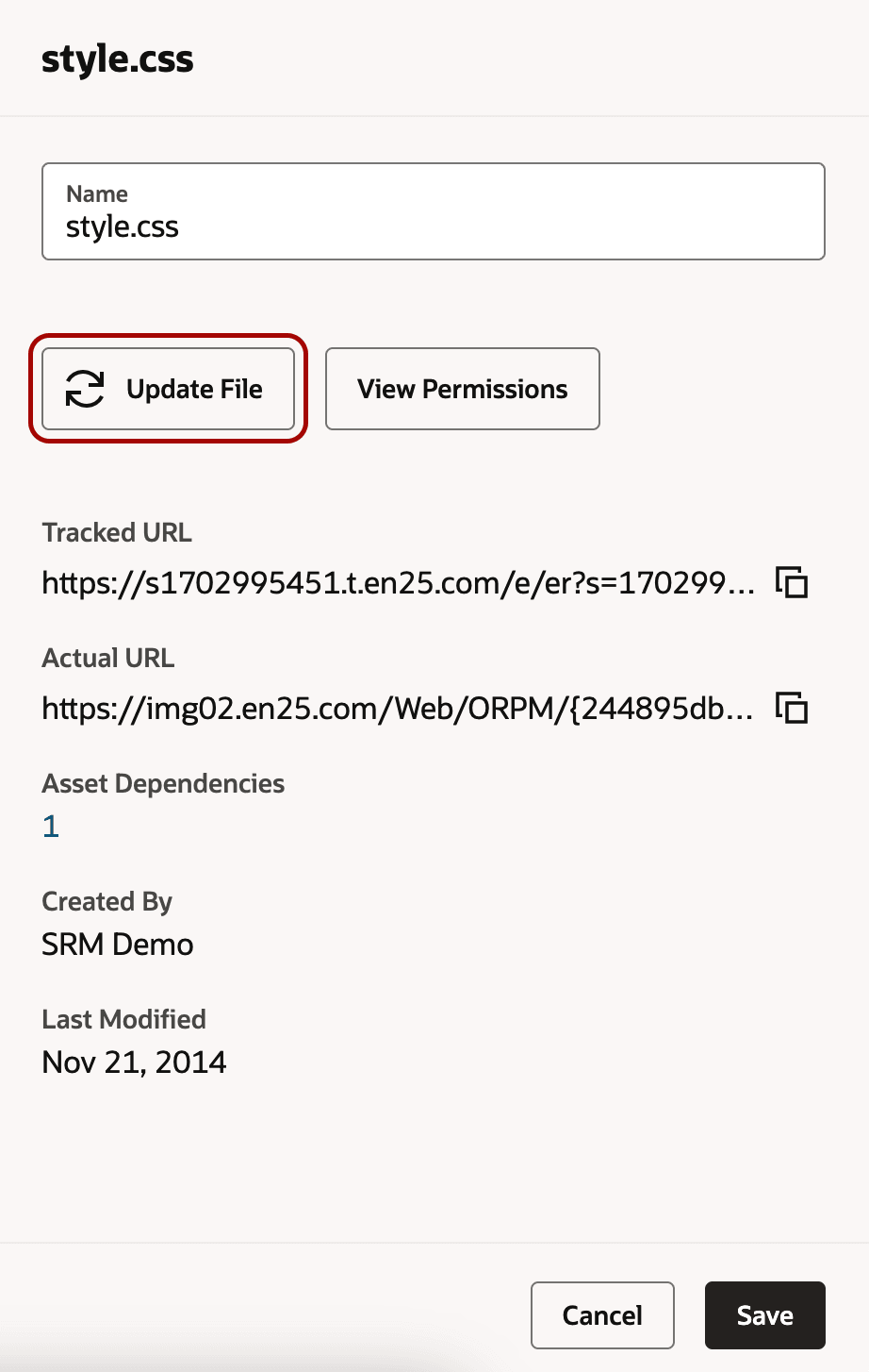 - Be aware of the dependent assets. Oracle Eloqua updates all assets dependent on the image or file.