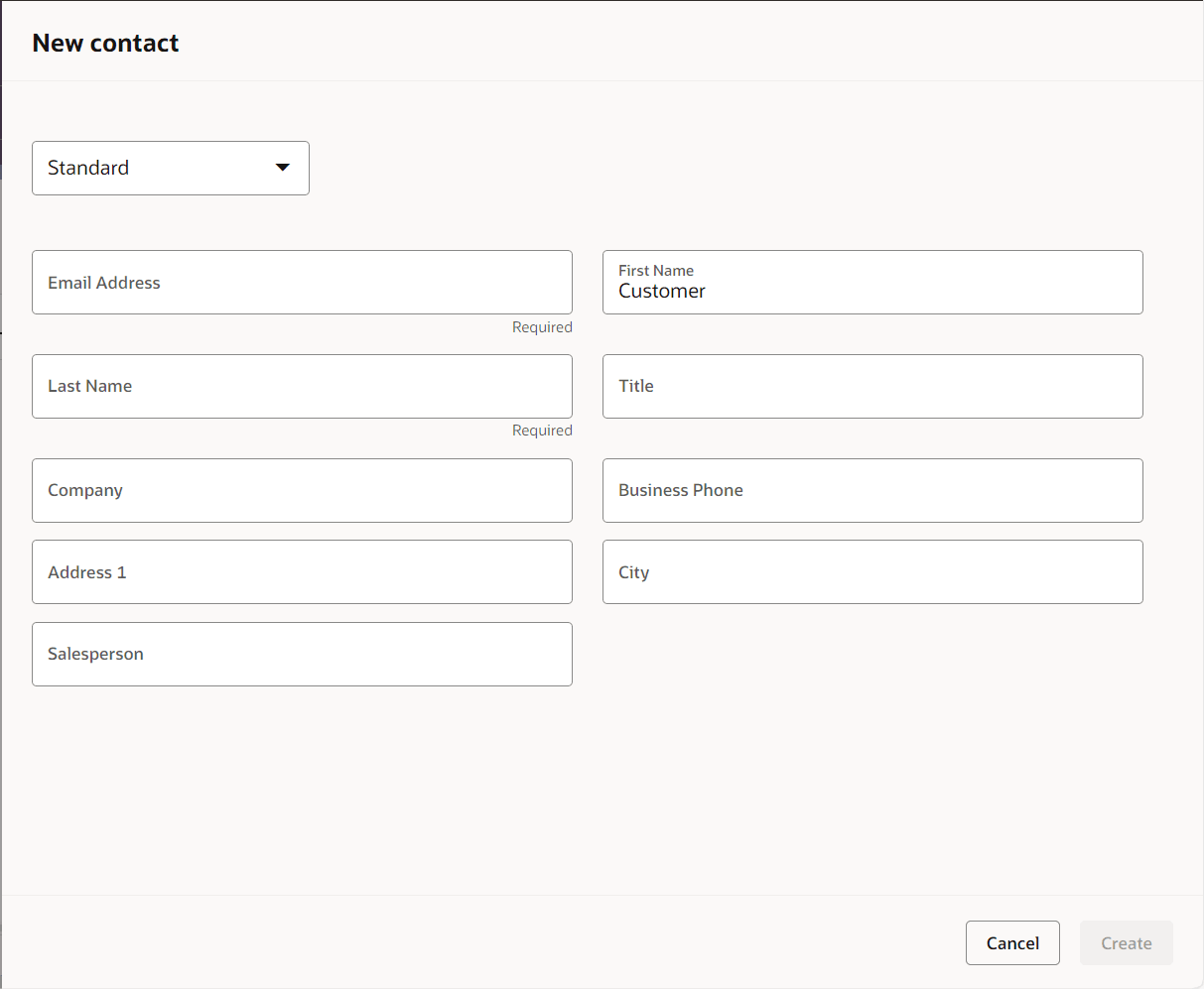 - In the Redwood experience, all required fields displayed must be completed before you can create the contact.