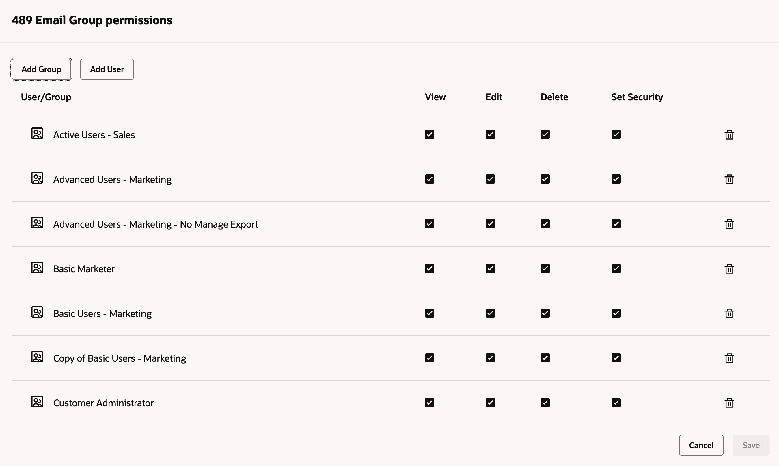 The email group creator or an administrator can customize who can view, edit, or delete an individual email groups. You can use this, for example, to restrict access to an email group when creating an email.