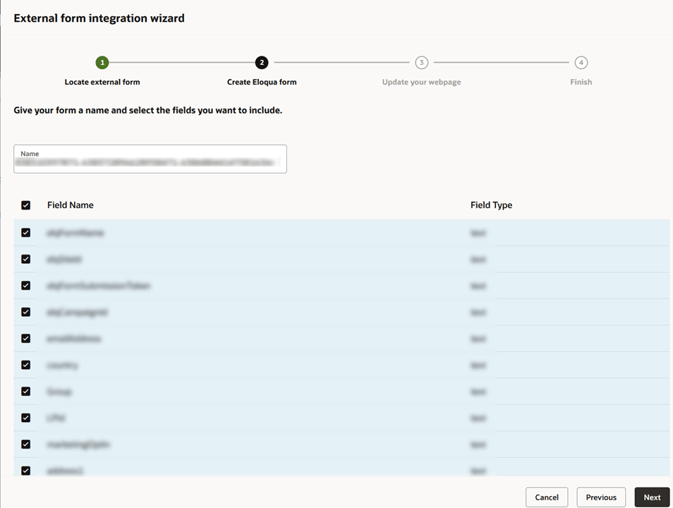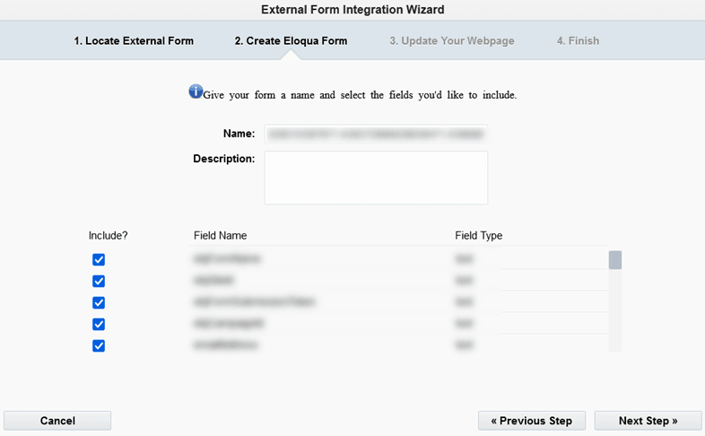 - Give the new Eloqua form a name and then select the fields that you want to add to the new form. Oracle Eloqua only collects data from these fields.