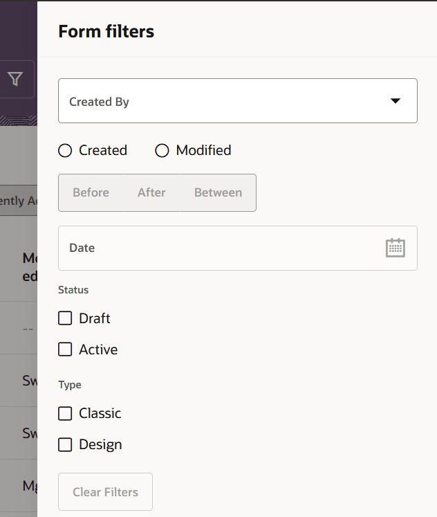 You may need to find and open an existing form to continue a task. You can use the Forms page to search for a specific form, or to filter for certain criteria.