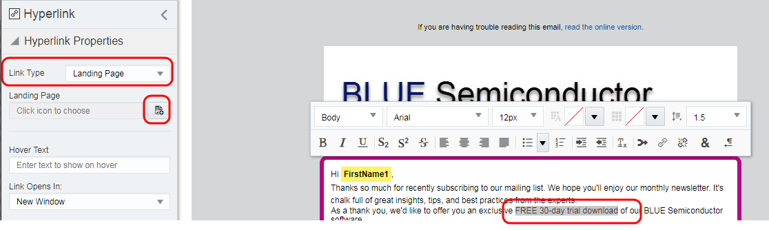 in the text toolbar. In the Hyperlink panel, select Landing Page from the Link Type drop-down.Click