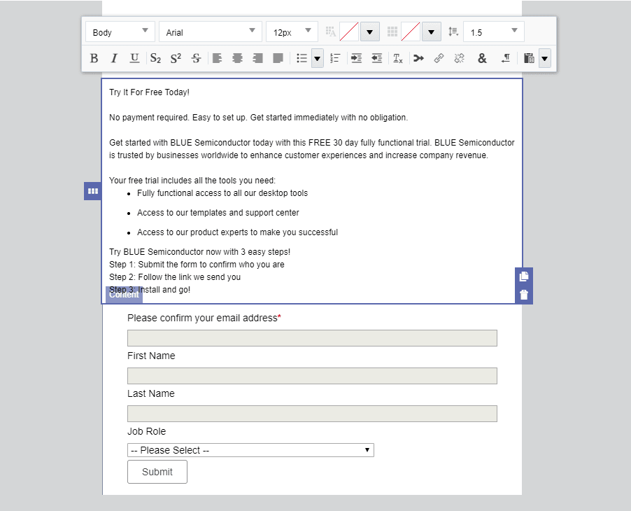 and drag the form content block to change its location in the landing page. - Select the text content block and use the toolbar to format the text.