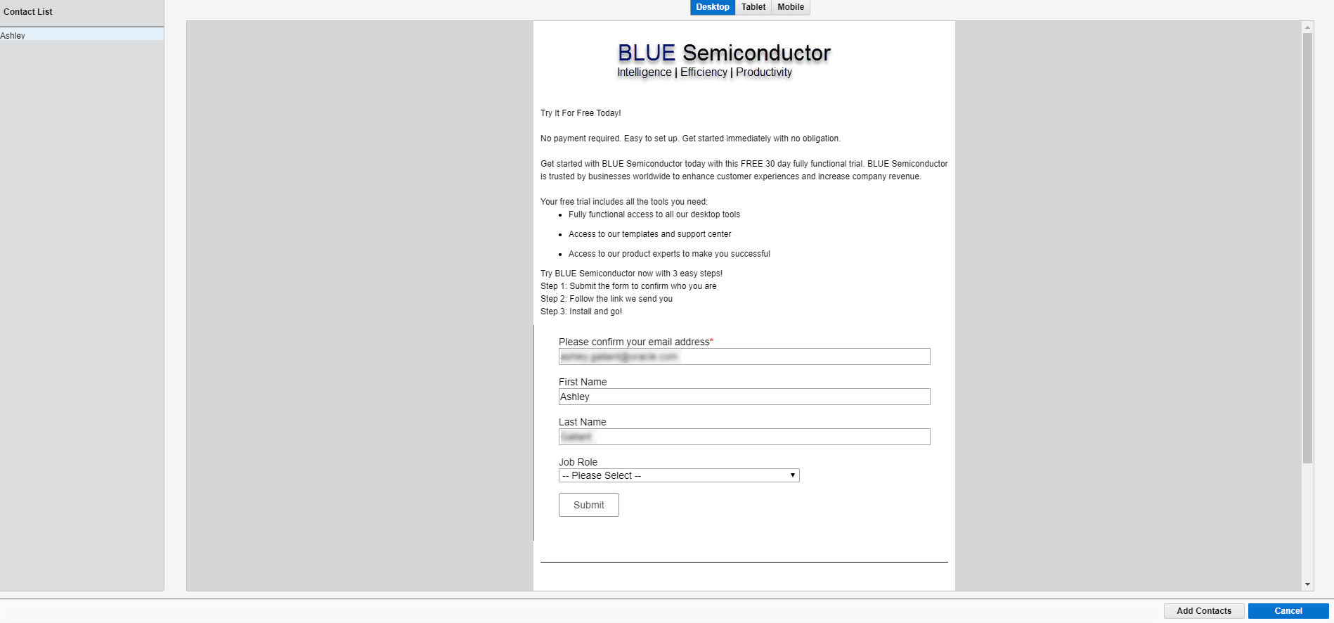 - Switch between Desktop, Tablet, and Mobile view to see how your landing page will look on different devices.