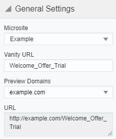 - Enter Welcome_Offer_Trial in the Vanity URL field. This is a friendly name for the landing page. The vanity URL must be unique. If X Invalid Vanity URL appears, the vanity URL is already in use.