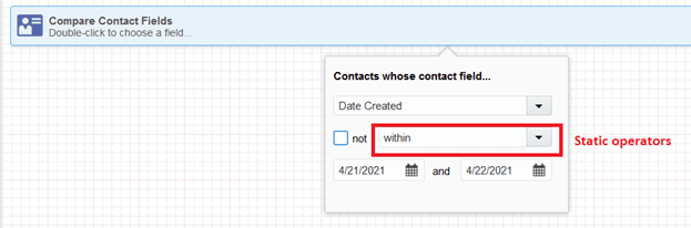 - Filter operators are divided into two categories: Static Operators (before, after, on or before, on or after, on, within) and Dynamic Operators (dynamically equal to, dynamically before, dynamically after, dynamically on or before, dynamically on or after, within the last, within the next).