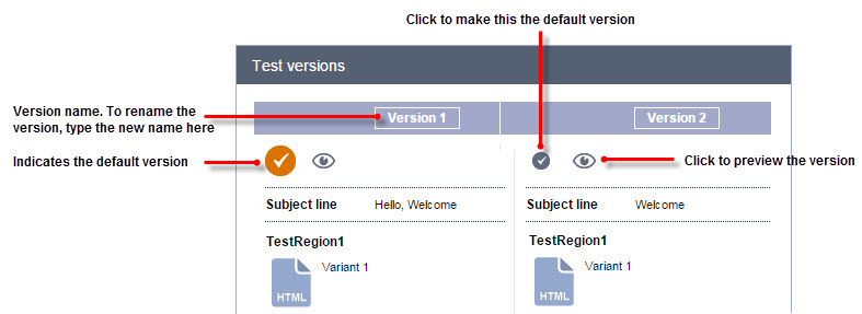 A version is a combination of all defined regions and variants. For example, if you define two variants for the subject line and three variants for the from name region, Oracle Responsys creates six test versions (2x3). Oracle Responsys supports up to 8 versions. One version is designated as the default. The default version will be used when you are not running the campaign in test mode, and if the winning version is deleted while the test is running. The first version you create is automatically designated as the default, but you can change it at any time. For example, after the winning version is selected, you can make it the default to use in the future.