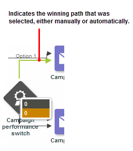 Tip: Automatic selection is designed to measure the results of one campaign per path and works best with comparable paths. For example, if you have one campaign on each path, it's easy to determine which campaign achieves the best results. However, if you have multiple campaigns and timers on each path, the effects of the campaign metrics you're evaluating become diluted. In this case, your best bet is to set the performance switch to manual winner selection and analyze the aggregate performance of each path yourself.