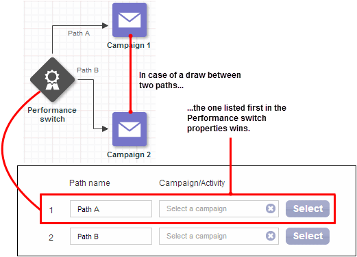 - If your performance switch is set to automatic selection and two or more campaigns yield the same performance, the path listed first in the performance switch properties is declared the winner.
