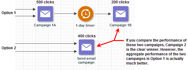 - Regardless of the selection mode, take a look at the results of your test to make sure you are measuring the right things. For example, the following illustration shows how the path with the best performing campaign is not necessarily the overall winner.