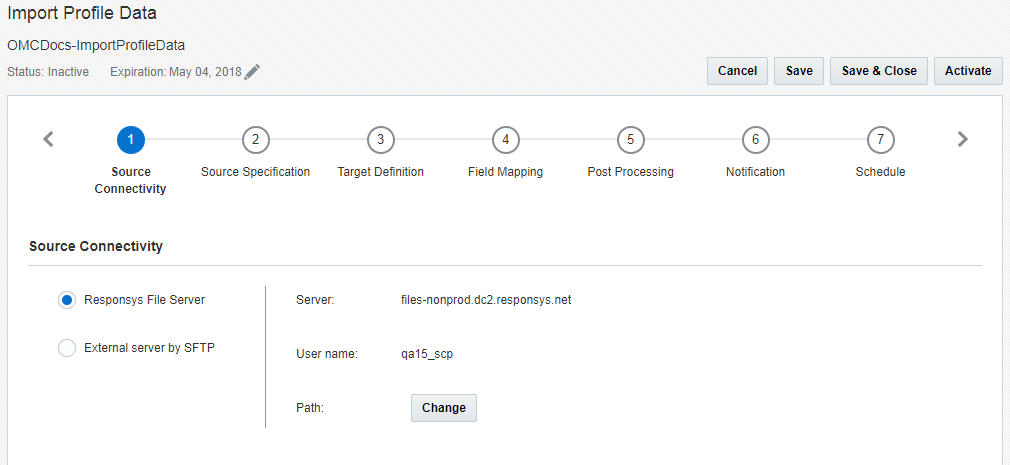 - Responsys-Dateiserver: Connect-Jobs können Daten über den Responsys-SCP-(Secure Copy Protocol-)Accountdateiserver importieren. Dieser Account enthält drei Verzeichnisse: Hochladen, Herunterladen und Archiv.