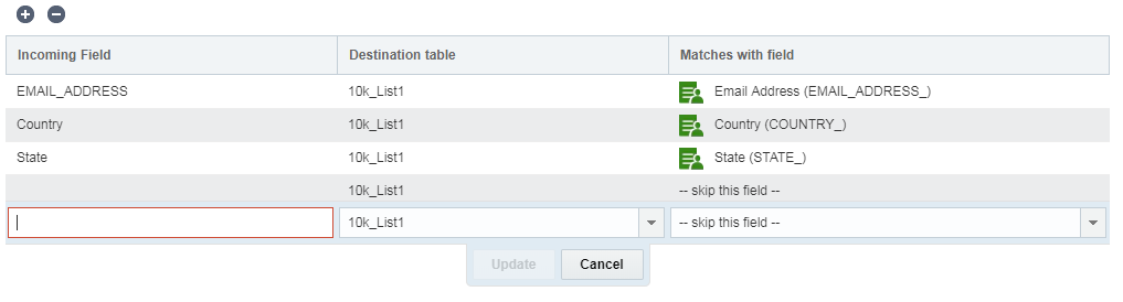 - Neue Datensätze anhand der Profillistenfelder mit vorhandenen Datensätzen abgleichen: Wählen Sie die Felder für den Abgleich neuer Datensätze mit vorhandenen Datensätzen aus. Wenn der Abgleich mit zwei Feldern erfolgen soll, klicken Sie auf "Hinzufügen", um ein zweites Feld hinzuzufügen.