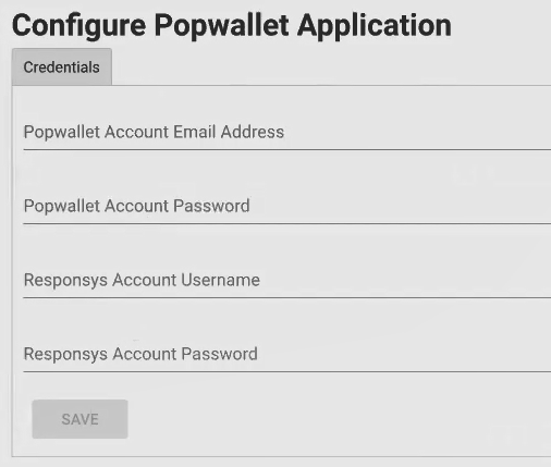 ). Die Seite zum Konfigurieren der Popwallet-App wird angezeigt. - Geben Sie auf der Registerkarte Zugangsdaten den Benutzernamen und das Kennwort für den Popwallet-Account sowie den Benutzernamen und das Kennwort für den Responsys-Account ein. Dabei handelt es sich um die Zugangsdaten für den Popwallet- und den Responsys-API-Benutzer, die im Abschnitt aufgeführt werden.