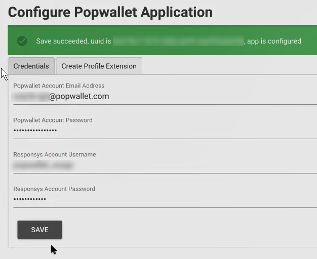 - Klicken Sie auf Speichern. Wenn Sie die Zugangsdaten speichern, versucht die App, sich bei beiden Services anzumelden, also bei Responsys und Popwallet.