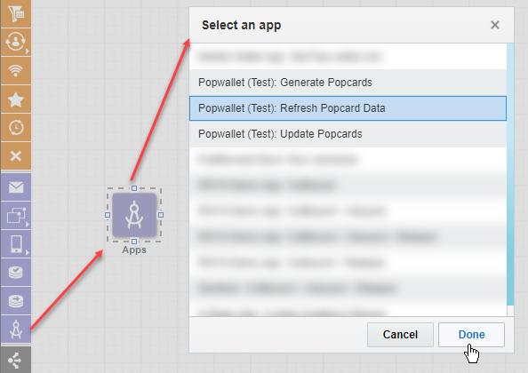 - Klicken Sie im Dialogfeld App auswählen auf die App Popwallet: Refresh Popcard Data, und klicken Sie auf Fertig. Das Dialogfeld Refresh Popcard Data configuration wird angezeigt.