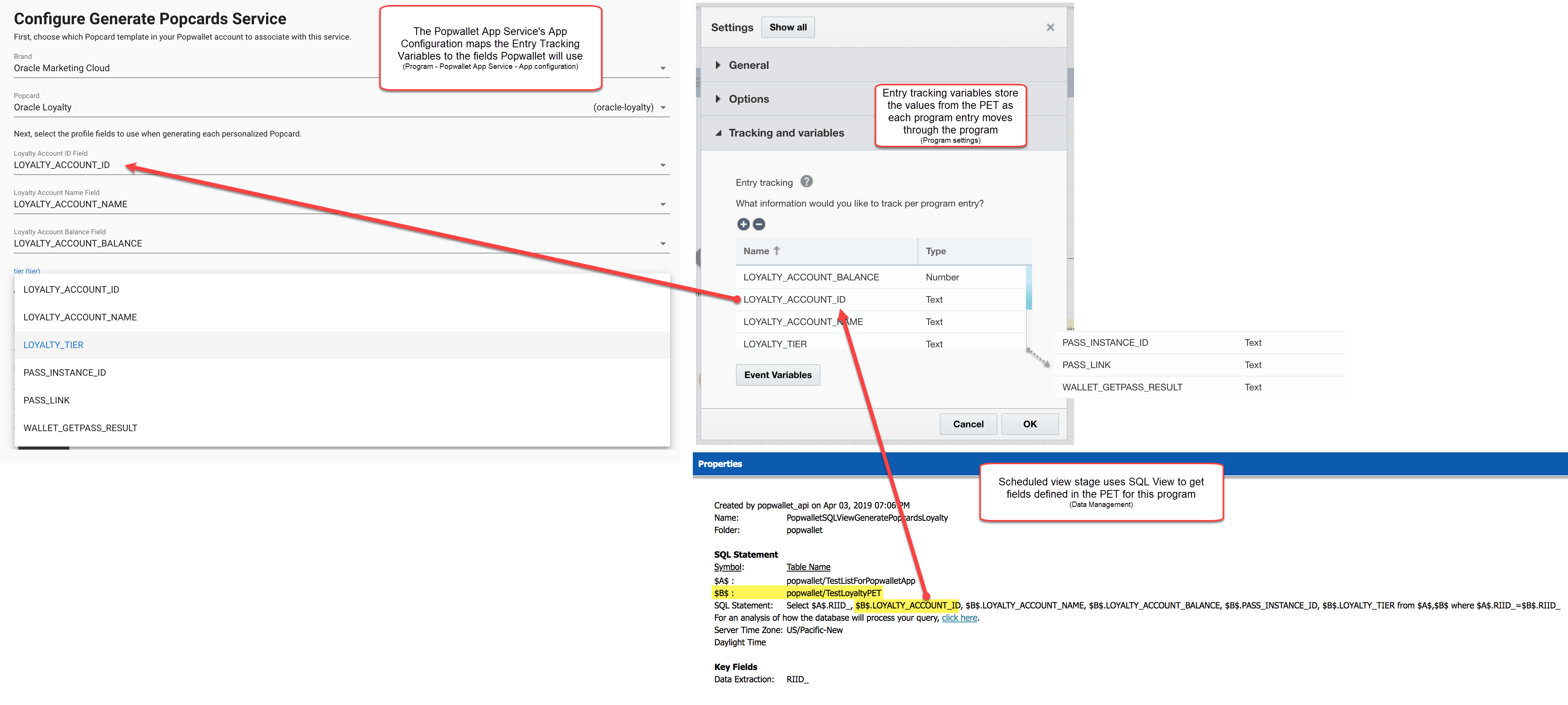 Im folgenden Bild ist zusammengefasst, wie die PET-Spalten, die über die SQL-Ansicht in das Programm gelangen, den Eintragstrackingvariablen und dann der Servicekonfiguration der Popwallet-App zugeordnet werden: