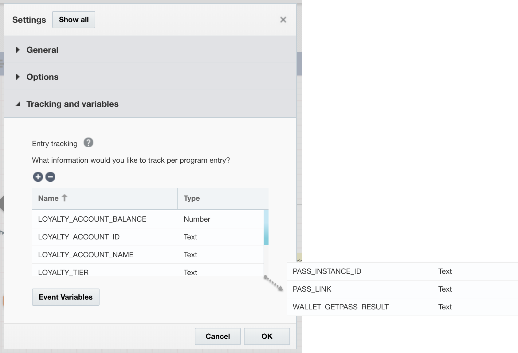 ), und geben Sie Werte für Name und Typ der Eintragstrackingvariablen ein: - Verwenden Sie für die Felder der Popwallet-PET den PET-Feldnamen, der in der Spalte Feldname in der PET-Datenfelderreferenz für die AppCloud-App Popwallet angezeigt wird. Die Eintragstrackingvariablen müssen mit den Feldnamen übereinstimmen, die Sie in der SQL-Ansicht verwendet haben, damit die Felder ordnungsgemäß festgelegt werden. Die Feldzuordnung für Felder, die Teil des Standarddatenmodells sind, erfolgt automatisch, wenn Sie die Servicephase der Popwallet-App konfigurieren. Sie müssen den Datentyp mit der größten Übereinstimmung verwenden. Beispiel: Das Feld LOYALTY_ACCOUNT_ID hat den Datentyp "Text" (bis zu 100 Zeichen). In diesem Fall wählen Sie beim Erstellen der Eintragstrackingvariablen Text als Typ.