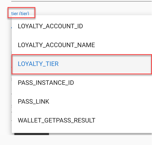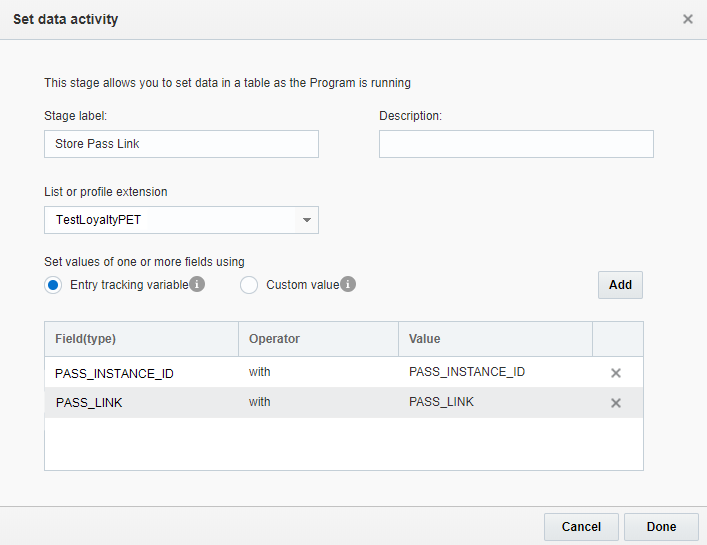 - Setzen Sie das Feld PASS_INSTANCE_ID in der PET auf den Wert der Eintragstrackingvariablen PASS_INSTANCE_ID. Dabei handelt es sich um die Pass-ID, die für jeden Kunden aus Popwallet zurückgegeben wird. Diese ID ist die eindeutige ID für den Pass des Kunden in Popwallet.
