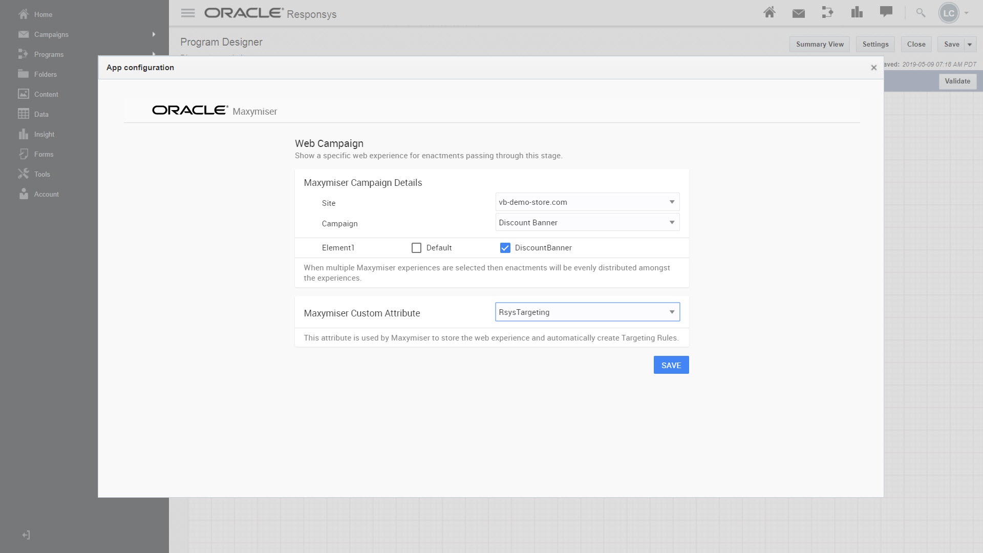 1. Bei der Veröffentlichung müssen Sie das benutzerdefinierte Maxymiser-Attribut, anhand dessen vom Responsys-Programm die Maxymiser-Regeln zur Zielgruppenselektion erstellt werden, in Maxymiser veröffentlichen, bevor Sie das Responsys-Programm starten. Nachdem Sie die Qualitätssicherung für die Kampagne durchgeführt haben, veröffentlichen Sie die Kampagne in Maxymiser als Live. Weitere Informationen zum Veröffentlichen von Kampagnen.