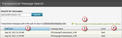 La página Búsqueda de mensaje transaccional muestra el estado de los mensajes transaccionales enviados a una dirección de correo electrónico especificada durante los últimos 30 días.