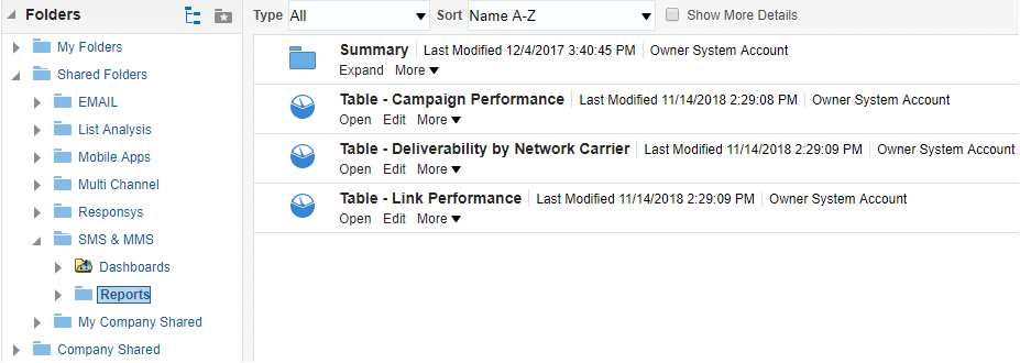 - Développez les dossiers partagés Courriel, SMS et MMS ou Applications mobiles, puis cliquez sur Rapports.