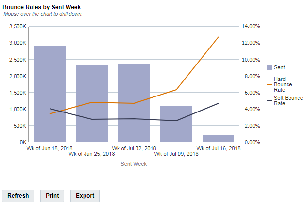 Ce tableau de bord vous aide à analyser les performances de délivrabilité par semaine. En savoir plus sur l'analyse de la délivrabilité dans le concepteur de messages électroniques.