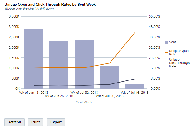Affiche les taux d'ouvertures uniques et de clics pour une semaine. Cliquez sur un point de données pour accéder à chaque jour de la semaine.