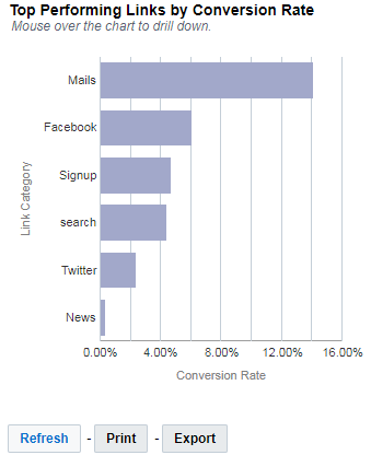Catégories de lien les plus performantes par taux de conversion. Pour analyser les liens associés à une catégorie de lien, cliquez sur la catégorie de lien afin d'accéder aux données détaillées.