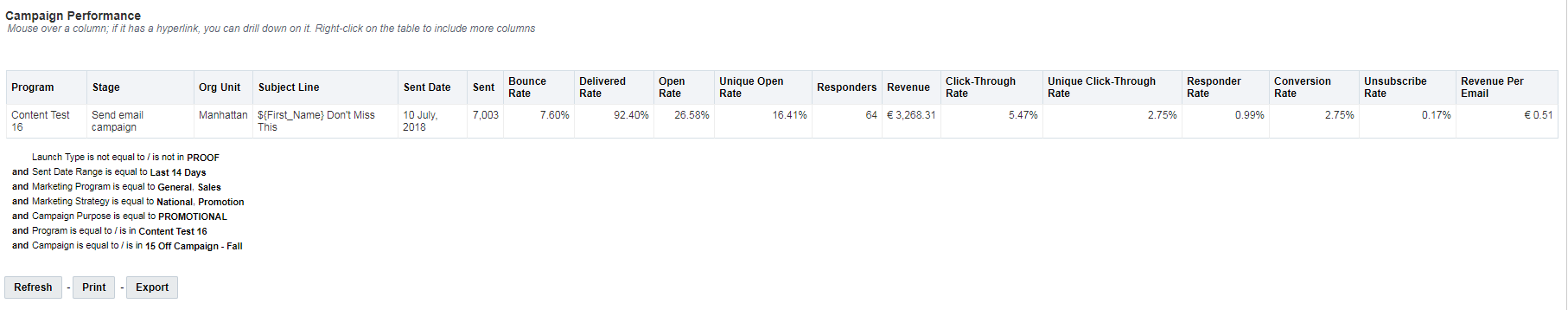 Les désabonnements ne sont pas enregistrés comme des clics et ne sont donc pas pris en compte dans le calcul du taux de clics. C'est pourquoi le taux de clics d'une campagne peut différer de son taux de désabonnement. En savoir plus sur la configuration de l'action de désabonnement par défaut pour les campagnes. - Revenu par tranche de 1 000 courriels - (Revenu total / Total livrés) * 1 000