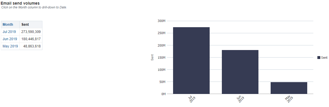 Cette section contient un tableau et un graphique à barres verticales qui affichent les volumes d'envoi de courriels par mois. Les dates du graphique et du tableau sont basées sur la date de facturation Oracle. Vous pouvez cliquer sur un mois dans le tableau, ou une colonne dans le graphique, pour consulter des dates spécifiques.
