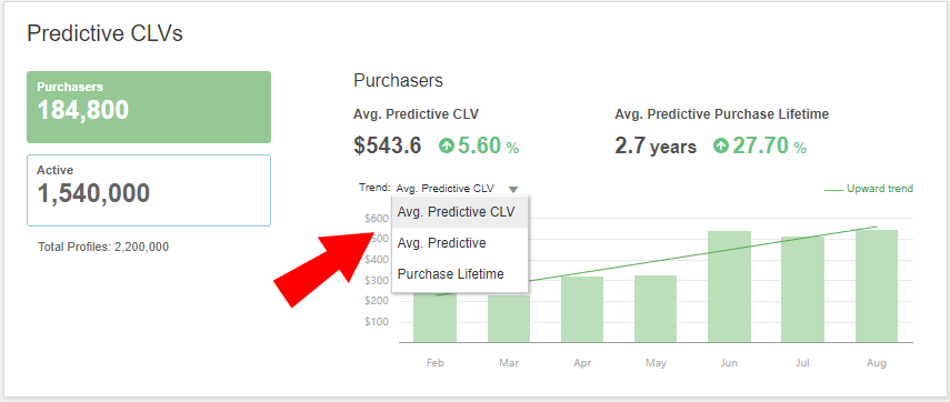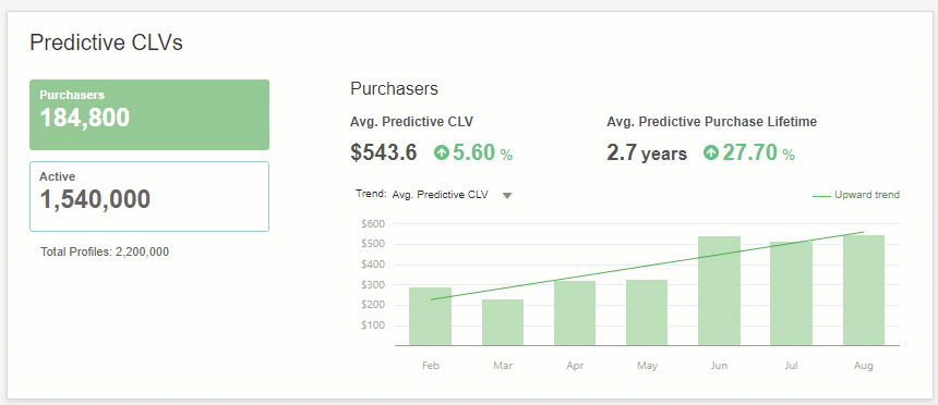Vous pouvez afficher la tendance Durée de vie achat prédictive moyenne ou la tendance Valeur vie client prédictive moyenne de votre liste de profils. Utilisez ces graphiques pour déterminer si les efforts marketing permettent d'augmenter les valeurs vie client.
