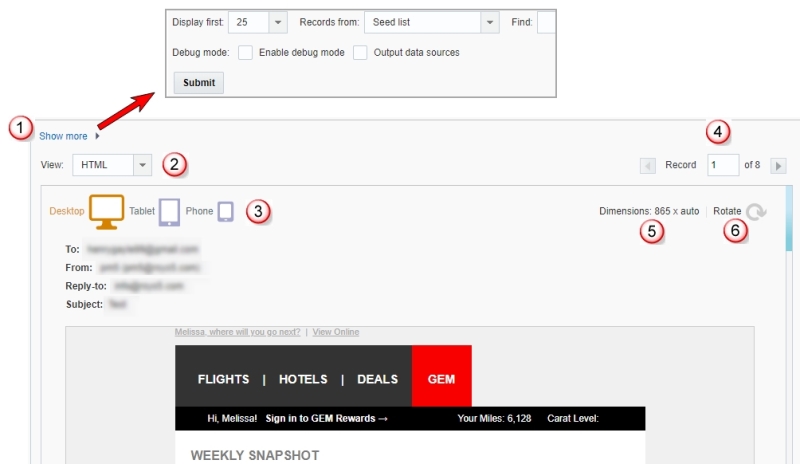 Cliquer pour sélectionner le nombre d'enregistrements à afficher et la source des données à utiliser pour la prévisualisation ou pour trouver un destinataire ou une chaîne spécifique.