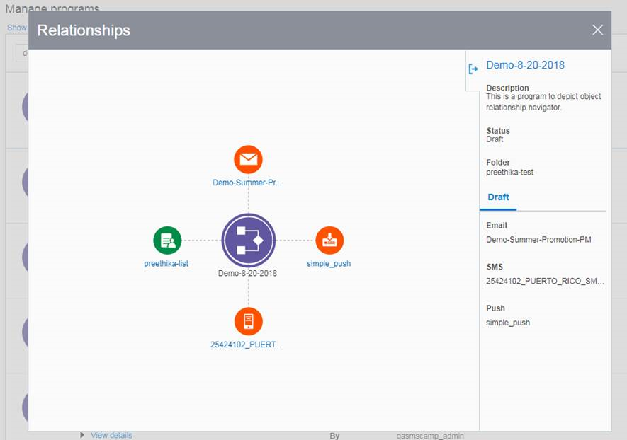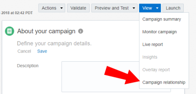 - La page Gérer les campagnes ou le classeur de la campagne (ou le concepteur de campagnes, si déployé pour votre compte avec la version 19C) pour afficher les relations d'une campagne spécifique.