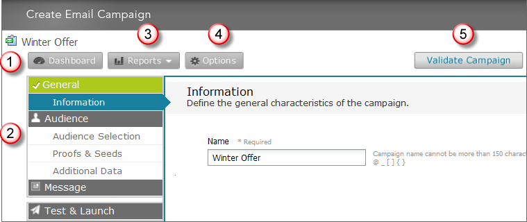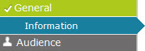 A savoir : Cliquez sur le bouton Valider la campagne pour voir toutes les erreurs dans la campagne, par section. Le bleu indique quelle étape est actuellement ouverte. Par exemple, dans l'illustration suivante, la section Général ne contient aucune erreur, la section Audience contient des erreurs et la page Informations est ouverte.