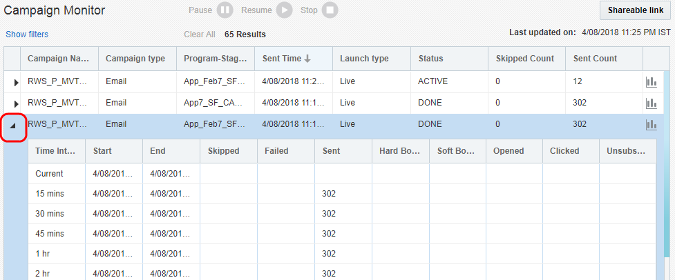 - Pour afficher les statistiques détaillées d'une campagne, cliquez sur la flèche en regard du nom de la campagne. En savoir plus sur les statistiques détaillées.